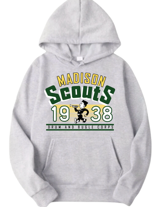 Celebrate decades of drum corps excellence with the Madison Scouts Vintage Bugler hooded sweatshirt. This soft, mid-weight ash-colored hoodie features the iconic Vintage Bugler logo alongside “1938,” commemorating the year the Scouts began their continuous operation — a proud milestone in the legacy of this legendary corps founded in 1920.